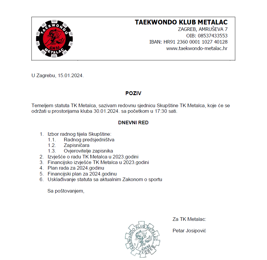POZIV NA REDOVNU SKUPŠTINU 30. SIJEČNJA 2024 u 17:30h Autor objave:lovro Objava objavljena:27 prosinca, 2021 Kategorija objave:Uncategorized Pročitaj više članaka Prethodna objavaJASTREB KUP VELEPOSLANIKA REPUBLIKE KOREJE Slijedeća objavaPrvenstvo Grada Zagreba Možda nešto kao Aktivan vikend za TK Metalac! 🥋 27 listopada, 2021 Dora Radek brončana na EP za mlađe seniore! 15 siječnja, 2026 prvenstvo Zagreba osnovnih škola! 🥋 7 prosinca, 2021